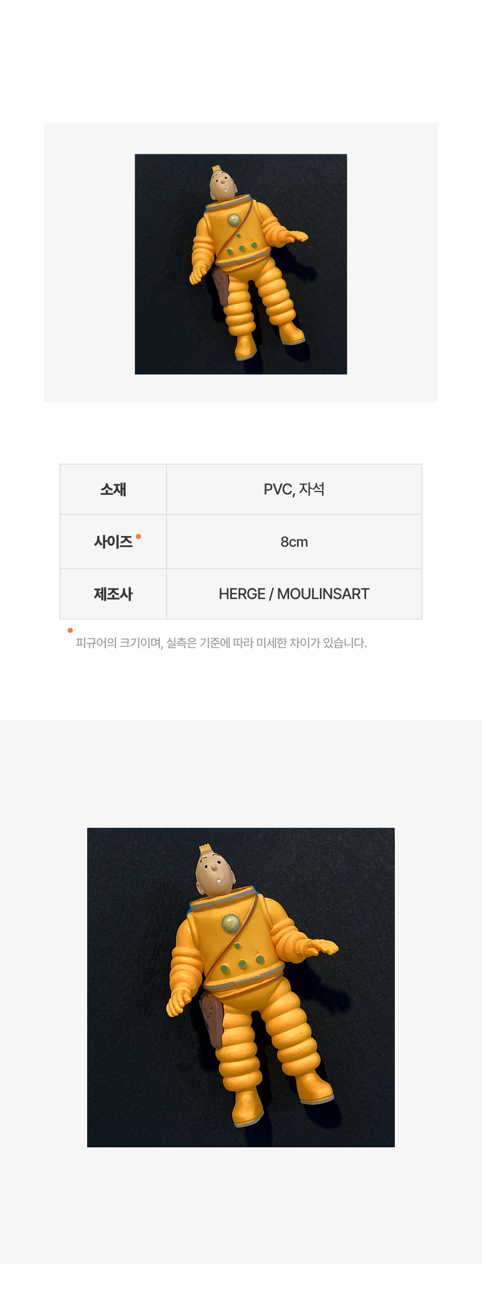 - 제작 과정에서 피규어의 자세와 발 모양에 약간씩의 차이가 발생합니다. 또한, PVC 상품은 재질 및 제작 과정 특성상 100% 완벽하게 도색되어 있는 제품이 거의 없습니다.소량의 잉크가 번지거나 얼룩이 묻어있는 경우 등이 있으므로 정도가 심하지 않은 경우엔 교환 / 반품이 불가합니다.